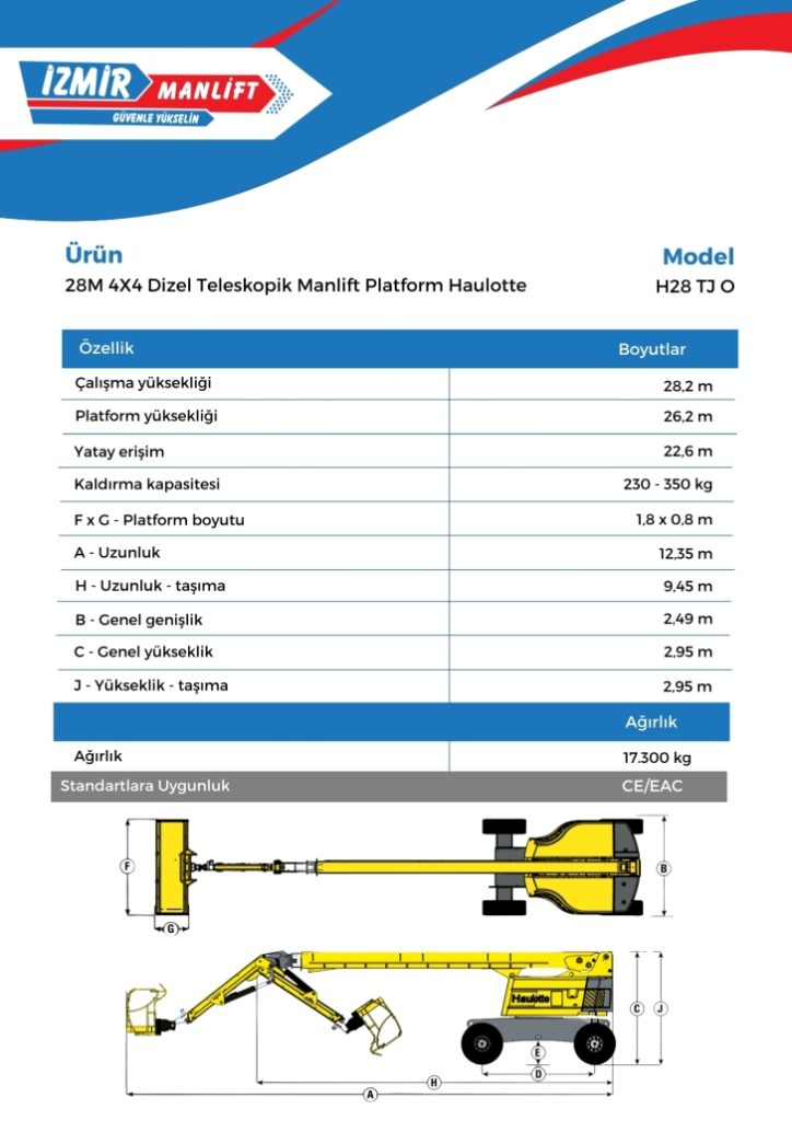 4X4 Haulotte H28 TJ O Dizel Teleskopik Platform Aliağa Manlift 28 Metre