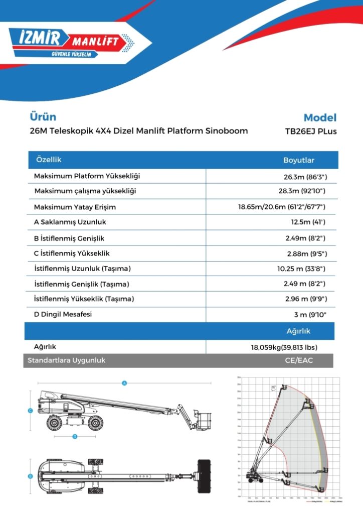 Aliağa Teleskopik Dizel Manlift Platform Sinoboom 26 Metrellik TB26EJ Plus 4X4